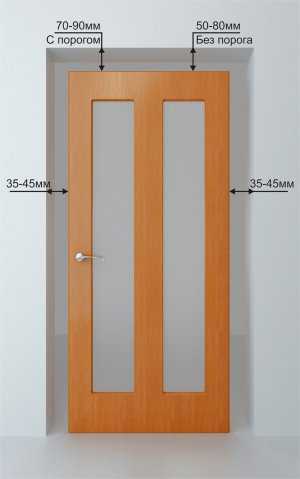 Высота рассчитывается аналогично, исходя из наличия порога и монтажных зазоров. Для этого к высоте полотна прибавляется толщина коробки, размер зазора (10-20 мм).