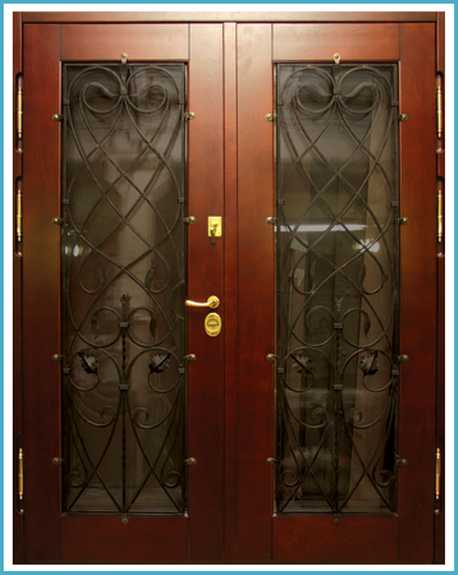 Основой каркаса дверного полотна является стальная рама, укрепленная профилями. Они размещены внутри двери таким образом, чтобы препятствовать различным деформациям: сгибание и скручивание. Чтобы защитить стекло, используются кованые элементы. Они также выполняют роль декоративных элементов. Срок эксплуатации изделий можно продлить, если использовать качественную краску.