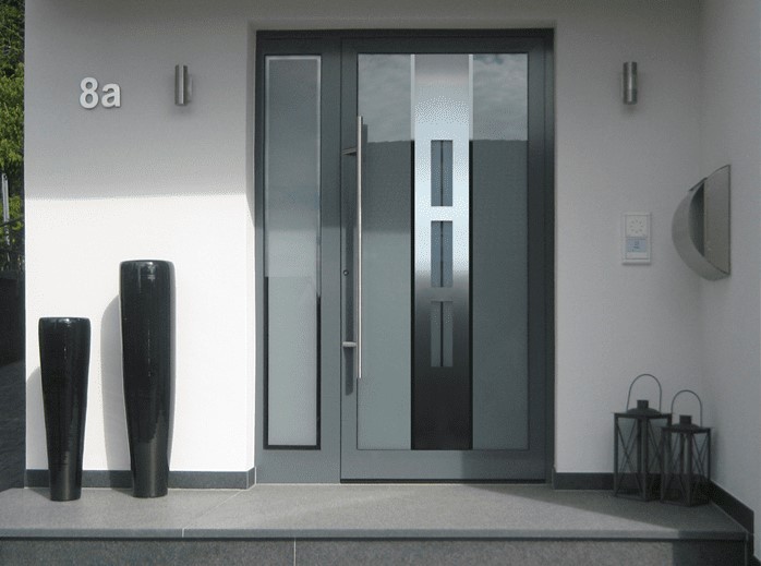 Входная стеклянная дверь состоит из алюминиевой рамы, которая заполнена стеклопакетом. Конфигурация рамы достаточно разнообразна, как и цветовая гамма. В остекленные секции (между стеклами) могут устанавливаться межрамные жалюзи, в том числе с дистанционным управлением.
