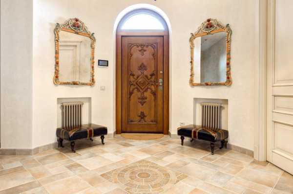На фото интерьер прихожей в доме и входная деревянная дверь с резными узорами.