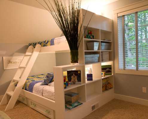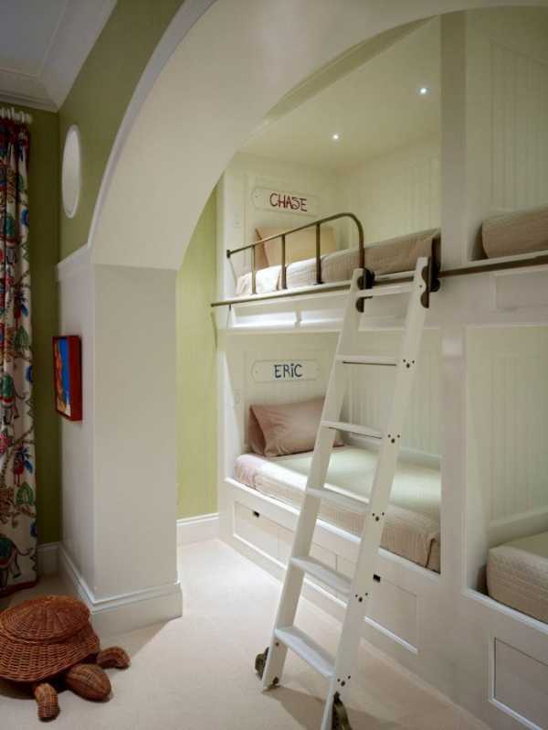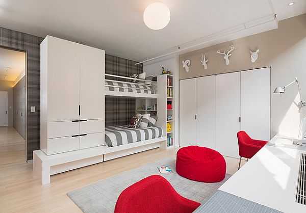 Детям однозначно понравится идея двухъярусных кроватей в нише, ведь большинство малышей обожает домики и укрытия. Для семьи с двумя детьми размещение в комнате по вертикали тоже заслуживает внимания.