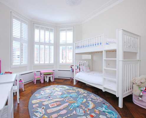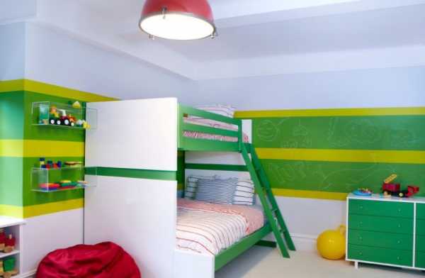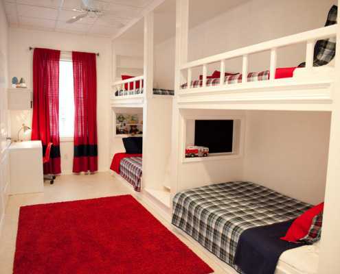 В спальне по длинной стене размещаем двухъярусные кровати. Лучше, если они будут одинаковые — это упорядочит интерьер и уменьшит визуальный «шум», который будут создавать разбросанные игрушки и книги.