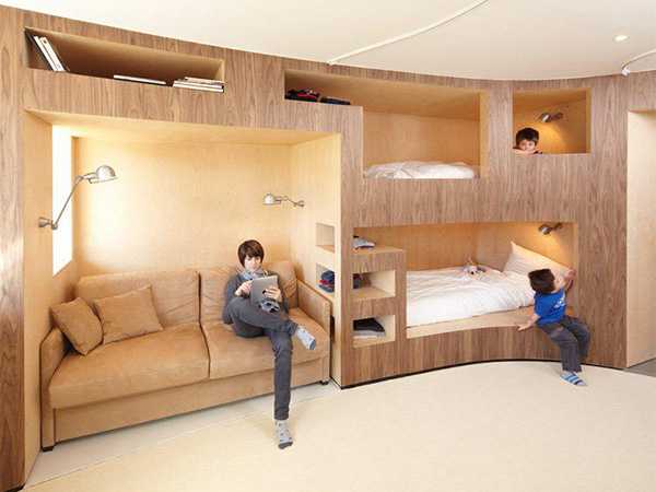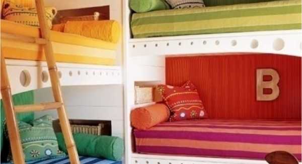 Идея размещения кроватей и рабочих мест для детей по типу японских гостиниц-капсул заслуживает внимания. При этом занята одна стена, а остальное место освобождается для игр и творчества. Интересное решение – выделить каждый отсек цветом.