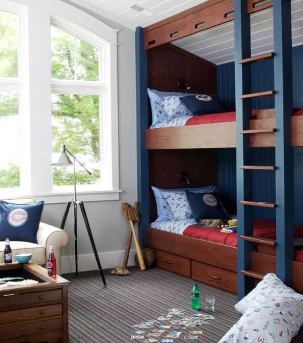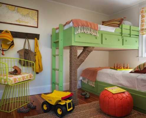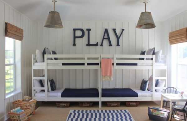 Восхитительный непринуждённый дизайн детской комнаты со спаренными многоуровневыми кроватями (проект Amy Maguire)