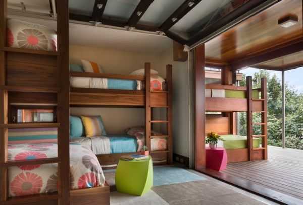 Следует отметить, что двухъярусные кровати популярны не только для обустройства детских в частных домах, но и оформления многоместных номеров гостиниц, коттеджей и курортных комплексов. При этом дизайнеры стремятся создавать уникальные и комфортные помещения, наполненные захватывающей и даже праздничной атмосферой.