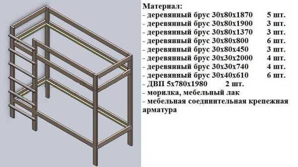 Чертеж каркаса двухэтажной кровати и необходимые материалы