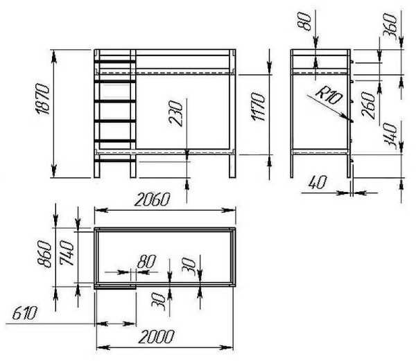 Чертеж двухъярусной кровати с размерами