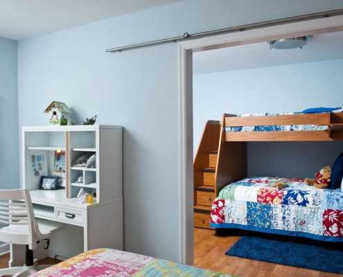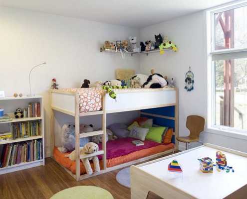 В детской для многодетных семей можно использовать одну часть комнаты в качестве зоны отдыха, разделенной на спальные места, изолированные друг от друга. Таким образом, каждый из детей получит необходимое личное пространство, а в комнате останется достаточно места для игр.
