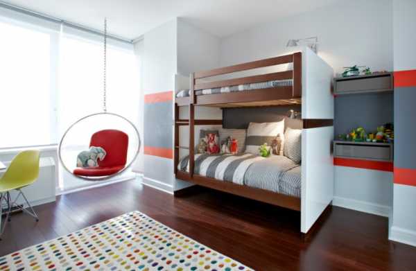Если ваши дети растут эстетами и уже предъявляют определённые требования к интерьеру, вас может заинтересовать вариант на фотографии ниже. Как можно заметить, дизайнеры создали своеобразное «царство геометрии» с элегантной цветовой гаммой. Всё пространство сформировано с помощью чётких линий и правильных фигур. В нём даже ограждения верхнего яруса кровати являются неотделимым элементом дизайна, а потрясающее кресло в круглой капсуле смотрится, как его завершающий и эффектный штрих.