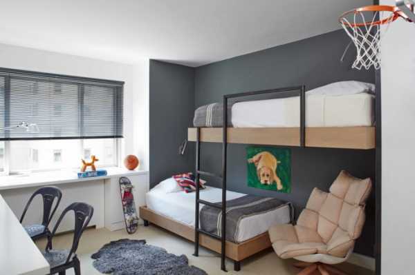 Комнату для мальчиков постарше можно оформлять проще, используя классические цвета мебели и стен. Двухъярусная кровать темных тонов со строгими лаконичными формами прекрасно впишется в такой интерьер.