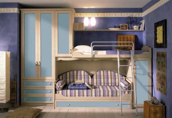 Двухъярусные кровати могут комбинироваться со шкафами, стеллажами или полочками. Этот вариант позволит использовать пространство максимально эффективно, что особенно важно в небольшой детской комнате.