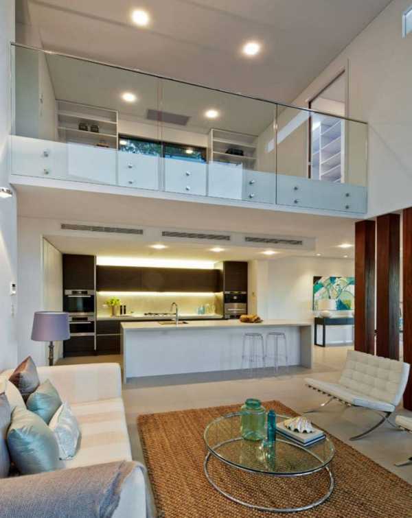 Второй ярус может занимать весь периметр комнаты или холла частного дома. Так наверху будет место для нескольких функциональных зон.