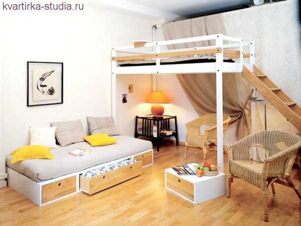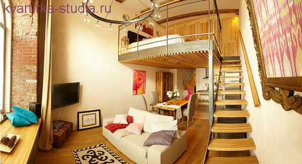 Как видно на фото, второй ярус изготовлен из натурального дерева и расположен над кухонной зоной. Вполне подойдет для самобытной жизни, с точки зрения практичности. Благодаря естественному освещению, квартира просторная и светлая. Идеальный вариант для небольшой семьи (см. Дизайн 2-х комнатной квартиры студии).