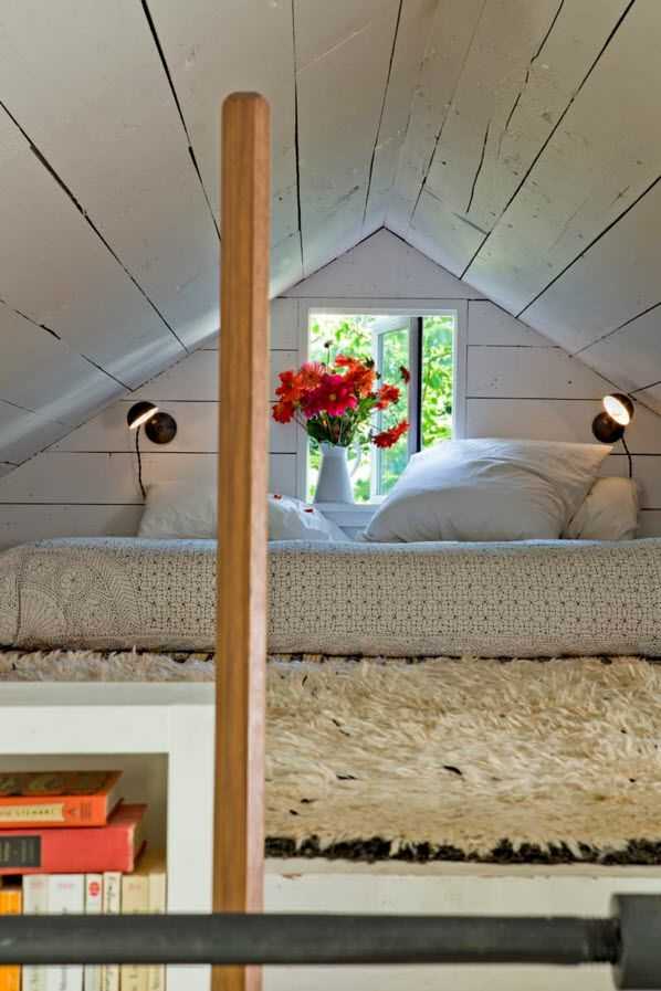 Первый этаж частных домов и помещение современных квартир все чаще представляет собой студию, в которой необходимо разместить сегменты гостиной, кухни и столовой. В случае если отдельной комнаты для оборудования спальни нет, а высота потолка позволяет обустроить верхний уровень, было бы ошибкой не воспользоваться такой возможностью. Оформление верхнего яруса в качестве спального места имеет ряд преимуществ – большую часть времени вы будете проводить там в горизонтальном положении и высота потолка в этом случае не будет играть решающей роли. Такое пространство способно выдержать и асимметрию, и большой скос потолка, ведь находится оно под самой крышей.