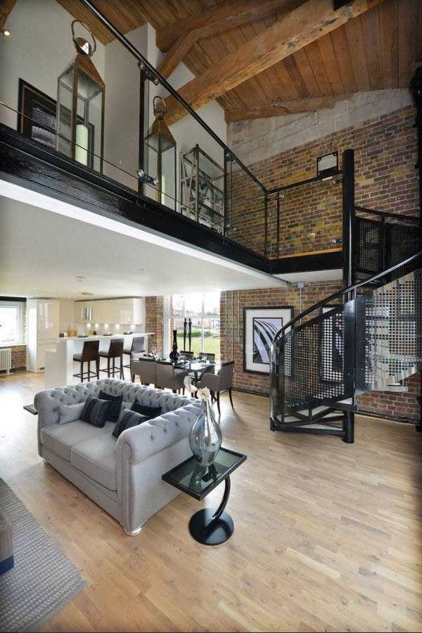 Роскошная винтовая лестница с металлическим каркасом и деревянными ступенями способна преобразить любое помещение, ста интерьерной доминантой. Немного индустриальности привнесут в дизайн помещения сетчатые экраны и перила из металла, окрашенного в темный цвет. Но если в конструкции самой лестницы подобное ограждение смотрится органично, то для защиты пространства верхнего уровня лучше использовать стеклянные экраны-ширмы. Так вы сможете обеспечить максимальное количество естественной освещенности второго уровня.