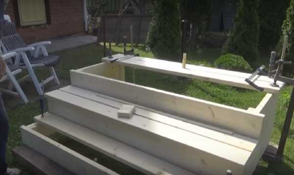 На первом этапе вырезаем заготовки для сборки боковин крыльца. Каждая боковина состоит из четырех деталей, три из которых — отрезки доски, четвертая – дополнительная рейка для увеличения боковины до требуемой высоты. Все заготовки выравниваются по разметочному уголку и склеиваются, как на фото, в специальной струбцине столярным клеем.
