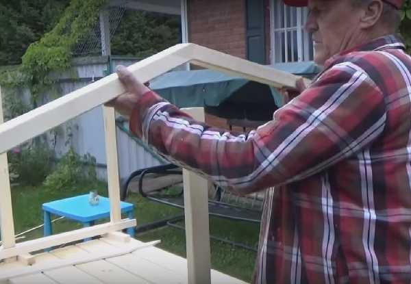 Сплошная поверхность боковин позволяет достаточно просто закрепить вертикальные стойки. Сами поручни перил можно построить в виде одного элемента, но для этого потребуется изготовить скрытое соединение двух брусьев под определенным углом наклонного поручня и горизонтального поручня перил ограждения, как на фото.