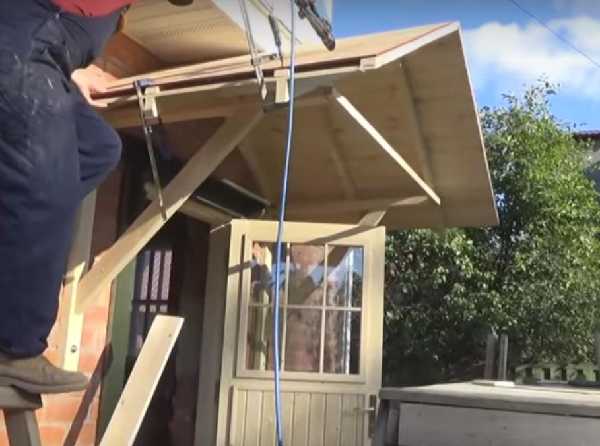 Дополнительным элементом, как низкой, так и высокой конструкции является козырек, его ширина должна быть больше, чем само крыльцо, а закрывать он должен не только площадку перед дверью, но и ступени.