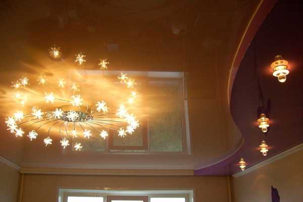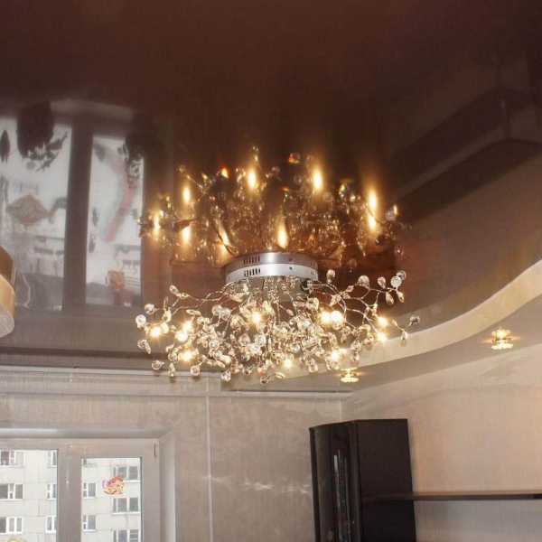 Люстра — центральный элемент. Обычно именно она является наиболее мощным источником света и главным украшением потолка, а иногда и помещения в целом. Отражаясь в зеркальной пленке, хрустальная люстра становится в два раза объемнее — это надо учитывать, чтобы не выбрать слишком громоздкую модель, если комната маленькая.