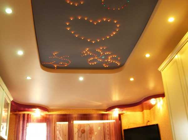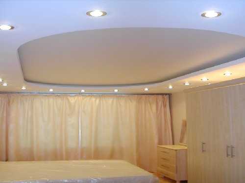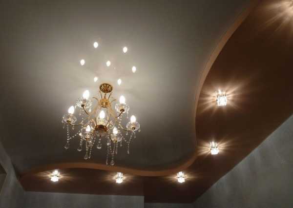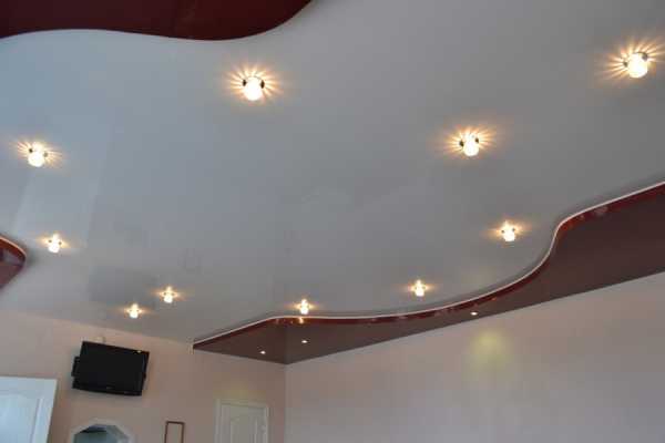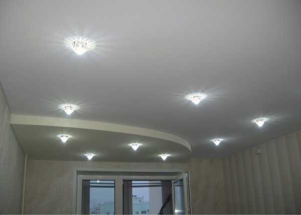 Если речь идёт о двухуровневой или трёхуровневой плоскости, то точечную подсветку лучше распологать в выпуклых частях. Таким образом потолок выглядит более объёмный и не нужно жертвовать высотой потолка на основной части.