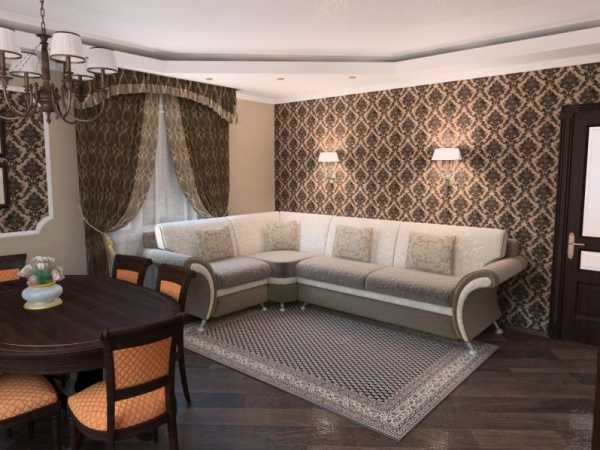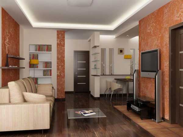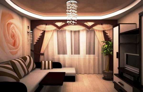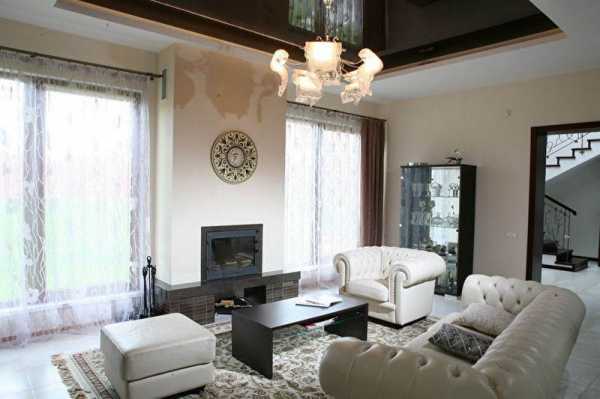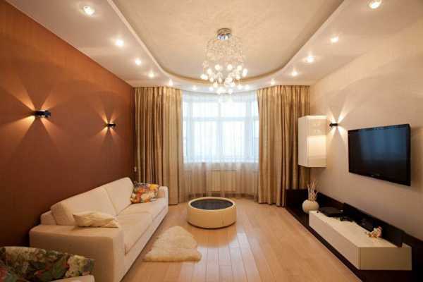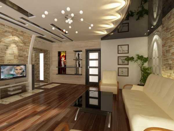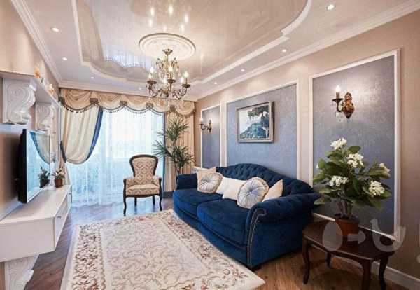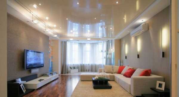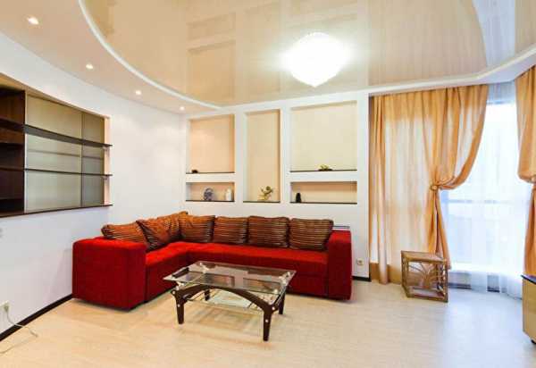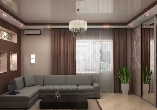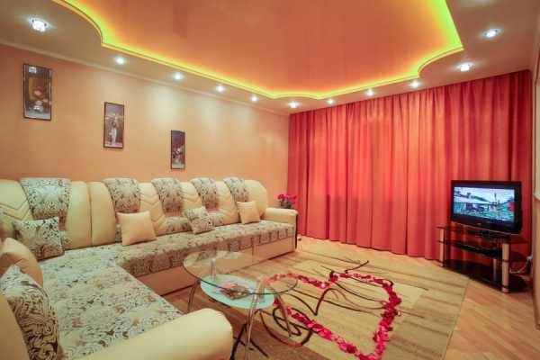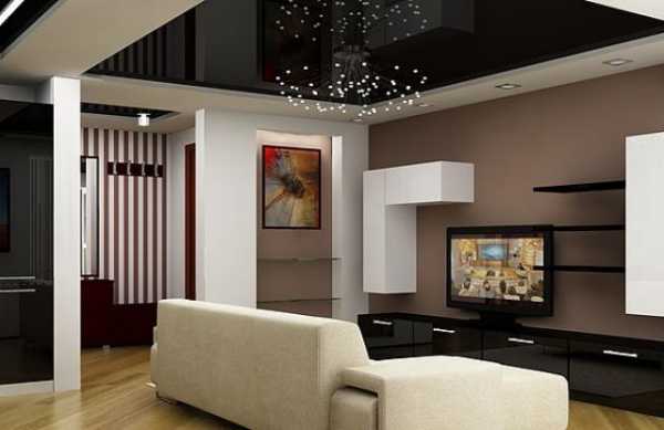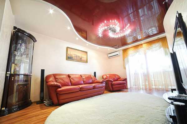 Вот тут вы можете увидеть типичный двухуровневый натяжной потолок в зале, это фото поможет понять, нравится ли вам такой вариант, в принципе. Если да, то имеет смысл продолжить чтение, так как у нас есть ещё много интересного по теме.