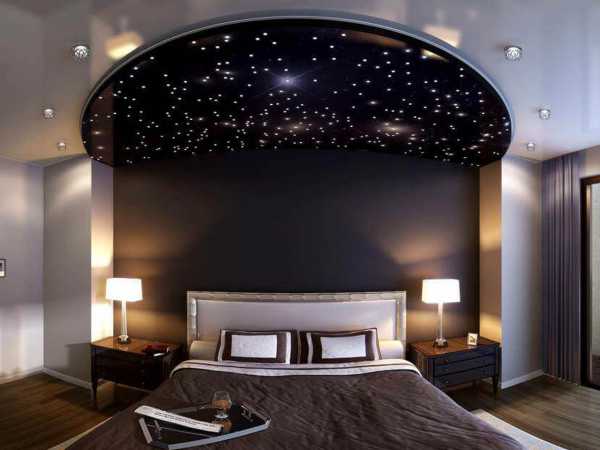 Для спальни часто выбирают потолок «звездное небо», причем оно может быть не только в черных или темно-синих тонах, но и в светлых: молочно-белом, розоватом, светло-голубом, а также с нежным мерцанием миниатюрных диодов-звезд.