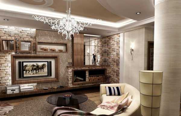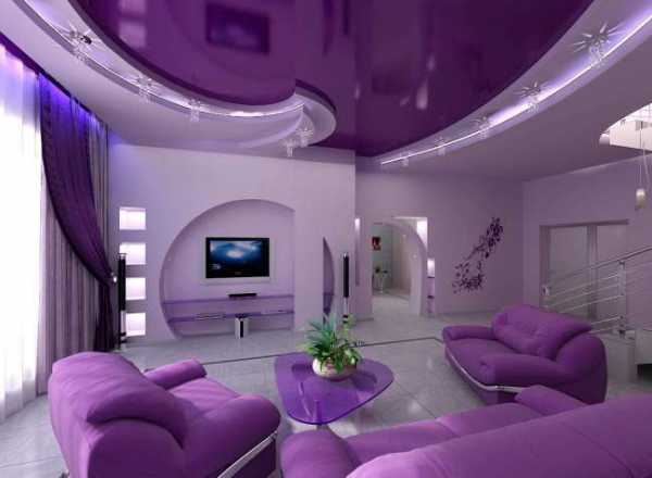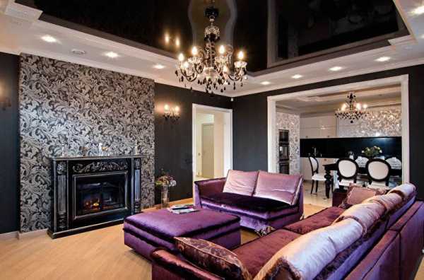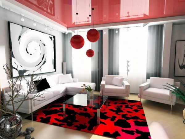 Стремление к роскоши и оригинальности с наибольшим размахом можно реализовать именно в гостиной. Эта комната лучше всего подходит для воплощения смелых, грандиозных решений: насыщенных оттенков, глубоких контрастов, фигур с необычным рельефом. При этом, чем больше площадь, тем интереснее может выглядеть потолок. Но в любом случае, желательно, чтобы он дополнял остальной интерьер, а не конкурировал с ним.