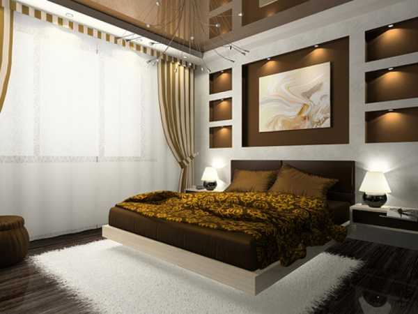Являясь в первую очередь комнатой для сна и отдыха, спальня не очень подходит для экспериментов с кричащими цветами или крупными фигурами. Здесь царствуют округлые линии, пастельные тона и мягкая подсветка.