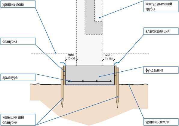 - Заливают фундамент. Кирпичная конструкция является тяжелой и поэтому нуждается в прочной опоре. Если котел будет размещаться на втором этаже дома или выше, то основанием для дымохода должно быть прочное железобетонное перекрытие. Дымоход лучше сделать в середине внутренней несущей стены или рядом с ней.