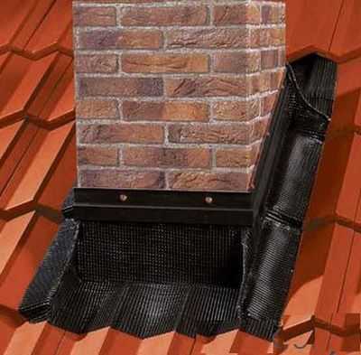 В качестве защитной плиты используются такие материалы, как свинцовое полотно и алюминиевые ленты с липким слоем. Кроме того, для обшивки потребуется сделать фартук и закрепить его с обеих сторон. Получившаяся конструкция называется воротниковой. Один ее край закрепляется в швах кладки, второй оставляется на верху крыши.