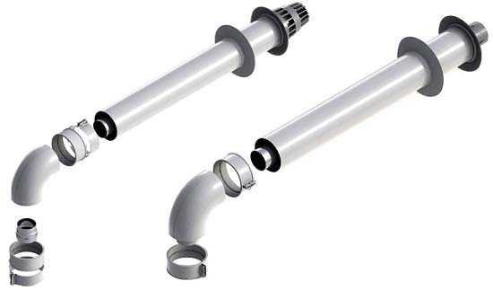 Такая труба называется коаксиальной и состоит из двух каналов, по внутреннему на улицу движутся продукты сжигания, а по внешнему проходит воздух, побуждаемый вентилятором. Все колонки без дымохода снабжены закрытой камерой сгорания и электронным блоком управления, воздух для горения они могут брать как с улицы, так и изнутри дома. При монтаже коаксиального комплекта соблюдается простое правило: чтобы конденсат не затекал по трубе в колонку, ее надо прокладывать с небольшим уклоном в сторону улицы.