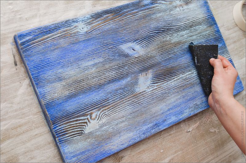 Через несколько минут берется губка и с ее помощью аккуратно снимается слой глазури, в результате чего деревянная поверхность приобретает рельеф. Можно оставить поверхность в таком виде и покрыть ее прозрачным лаком, если такой цвет состаренного дерева вам по вкусу.