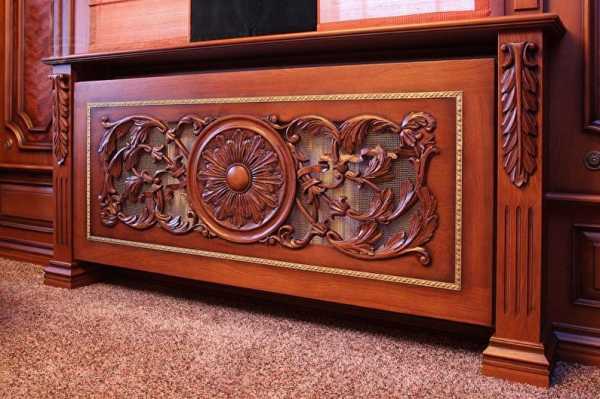 2. Дерево. Этот экологически безвредный материал наделен массой достоинств. В первую очередь стоит отметить высокую теплоотдачу и эстетичность, которая позволяет панелям отлично гармонировать с окружающей обстановкой. Дерево хорошо поддается обработке, поэтому экраны для батарей могут иметь самый роскошный вид с элементами резьбы.