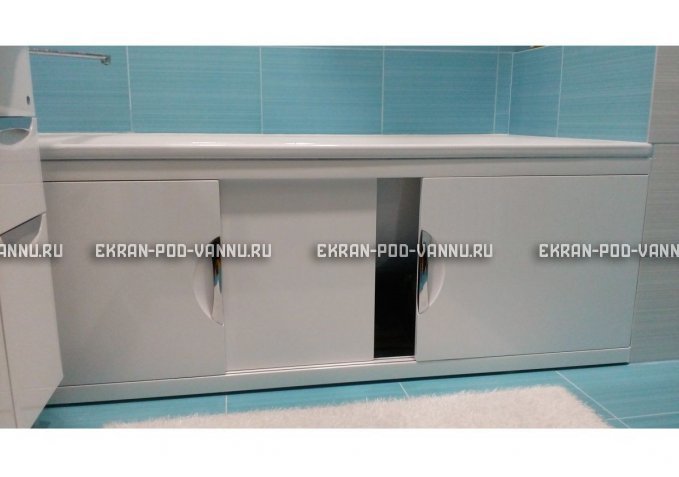 За дверцами таких раздвижной модели экранов можно дополнительно сделать полочки для хранения бытовой химии, а ручки на дверцах сделать из съёмных присосок, которые будут цепляться только при необходимости. В остальное же время такая конструкция будет ровной, без ручек, во избежание любопытствующих детских рук.