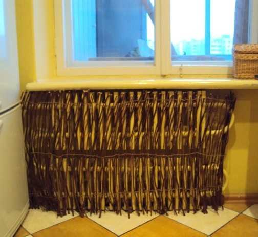Необычный экран для батареи на кухне их плетеных прутьев