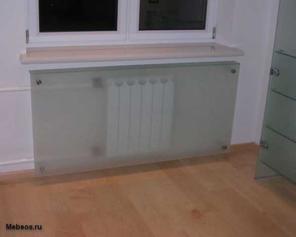 - Стеклянные экраны на радиаторы появились несколько лет назад. Они неидеальны с точки зрения отопления, но имеют привлекательный вид. Делают их из особого закаленного стекла, матируют или наносят рисунок.