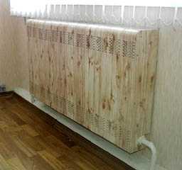 - Деревянные экраны для батарей. Преимуществами такого материала считается хороший внешний вид, хорошая гибкость и возможность создавать разнообразные конструкции. В качестве недостатков можно отметить достаточно низкую теплопроводность. Хотя даже этот отрицательный показатель можно обратить в пользу, при грамотной установке и изготовлении