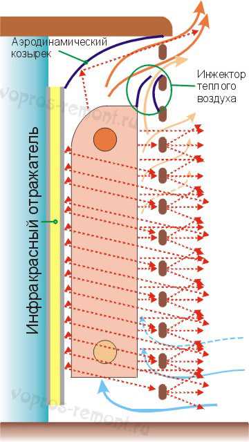 Разрез экрана с радиатором отопления, обеспечивающего не уступающую исходной теплоотдачу, показан на рисунке. Помимо выше описанного, в конструкции две изюминки: аэродинамический козырек и инжектор теплого воздуха. Изготавливаются они из жести, оцинковки, или даже из картона. В последнем случае внутреннюю сторону козырька нужно оклеить алюминиевой фольгой (подойдет рукав для запекания).