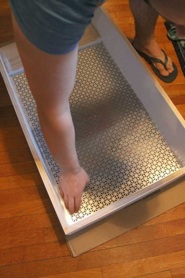 Загрунтуйте деревянный экран для радиатора высококачественной грунтовкой. Пока грунтовка сохнет, возьмите заготовленный лист белой жестяной сетки и для радиатора, протрите его чистой влажной тканью, чтобы удалить пыль и грязь.