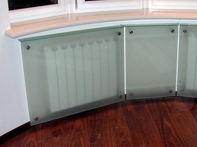 Закрыть таким стеклом можно практически все отопительные приборы. Форма необязательно должна быть плоской, можно сделать и гнутую конструкцию.