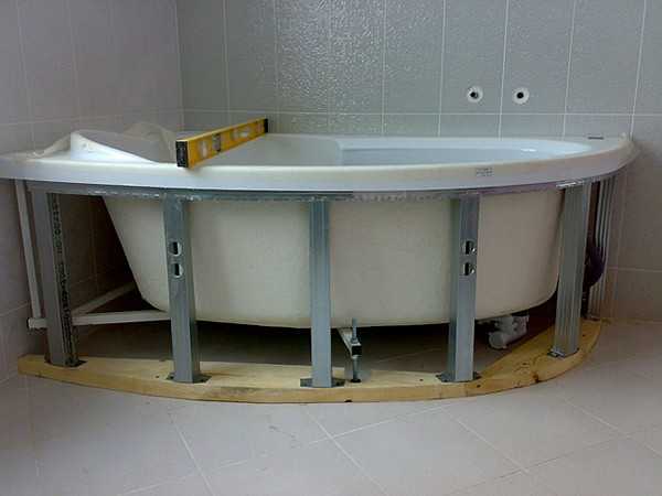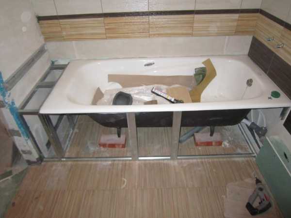 Из металлических профилей делается каркас. Исходя из разметок на стене делается П-образная конструкция. С помощью саморезов она закрепляется к стене и полу. После прикрепления каркаса, для придания большей жёсткости конструкции делаются поперечины. Для ванны длиной 150 см достаточно трёх поперечин. При ширине 70 см делается одна поперечина.В верхних профилях, которые ложатся под края ванны, предварительно делаются отверстия в 3 мм и нарезается резьба. В чугунной ванне делаются отверстия сверлом по металлу глубиной не более 5 мм. Верхние профили крепятся к ванной болтами М3 длиной 3 мм, промазанными жидкими гвоздями, на расстоянии 16−18 мм от края ванны. К акриловым ваннам профили крепятся с помощью жидких гвоздей.