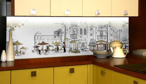 - Популярным сегодня решением стали фартуки с фотоизображением. Стеновые панели из любого материала выпускают с фото: пластик, МДФ, ДСП и даже дерево, хотя оно декоративно само по себе. Но стекло предоставляет совершенно другие дизайнерские возможности нанесения изображения на фартук.