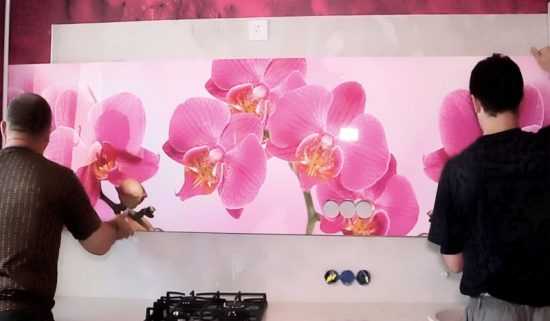 Сделать такой фартук просто, если речь не идет об акриловых панелях. Последний вариант, тем более с фотопечатью, изготавливается точно по размерам.