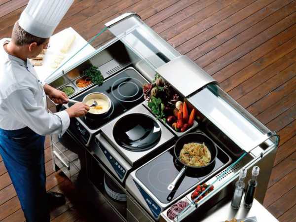 Настоящий прорыв в области термической обработки продуктов совершили разработчики индукционных плит. Электромагнитное поле воздействует на содержимое кастрюли или сковороды моментально, не нагревая конфорку и не отдавая тепло в окружающую среду. Поверхность, подвергающаяся воздействию магнитных волн, безопасна, об неё невозможно обжечься, она просто идеальна для разогрева, приготовления омлетов, соте, фламбе на шведских столах. Источником энергии служат обычные розетки 220/380 В, что особенно важно для предприятий, предоставляющих кейтеринг. Параметры (конфигурация, ширина, вес, мощность, число зон нагрева) зависят от производителя и модели.
