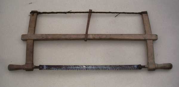 Инструмент выполнен в виде деревянного станка – лучка, в котором натянутое полотно закреплено посредством шпилек между двух ручек. Полотно располагается в нижней части станка, в то время как в верхней части ручки соединены тетивой.
