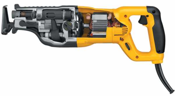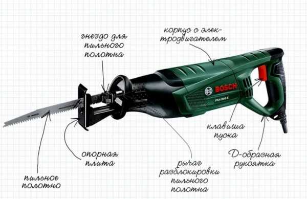 Конструкция электроножовки достаточно проста и похожа на устройство многих электроинструментов. В ее состав входят: