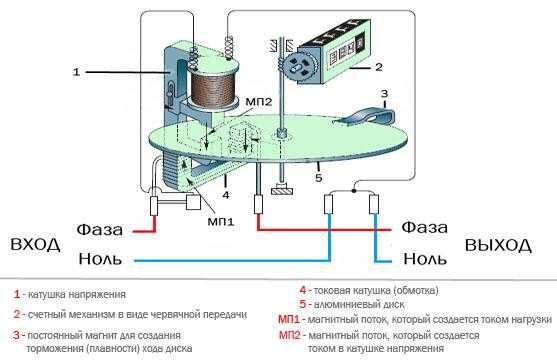 Принцип работы индукционных счетчиков прост: катушки тока и напряжения создают магнитное поле, которое действует на диск, он, в свою очередь, вращает счетное устройство. Скорость вращения диска зависит от силы тока и напряжения.