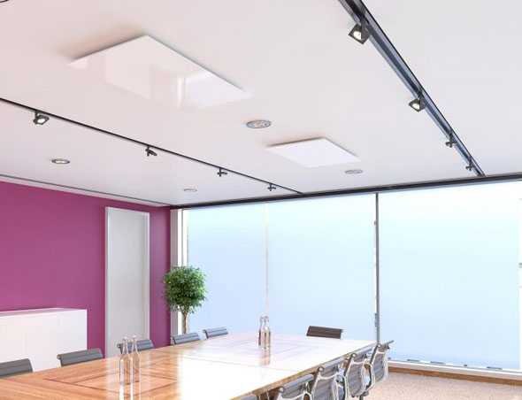 Потолочные инфракрасные панели не занимают много места. Их можно применять в помещениях высотой более трех метров. Они отличаются бесшумностью работы, экологической безопасностью и возможностью организации нагрева определенного участка. Панели для обогрева помещений удобно устанавливать и эксплуатировать. Некоторые производители кассетных потолков комплектуют свои изделия специальными обогревателями.