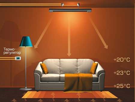 Принцип работы инфракрасных обогревателей совершенно иной: в процессе работы прибора, в первую очередь, нагреваются предметы в комнате, на которые попадает инфракрасное излучение. Это означает, что «порцию» тепла получают все предметы мебели, стены, полы и, конечно же, люди, находящиеся в помещении. И лишь после этого тепло начинает распределяться в воздухе.