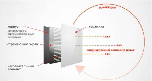 Нагрев осуществляется внутренним элементом на карбоновой основе. Принцип действия основан на продуцировании инфракрасного излучения, благодаря которому и осуществляется перенос тепловой энергии. В какой-то степени имеет место и эффект конвекции, холодный воздух помещения контактирует с нагретой поверхностью прибора, естественным образом поднимается вверх, осуществляется постоянная циркуляция воздушных масс. Масса данных устройств невелика, что упрощает монтаж.